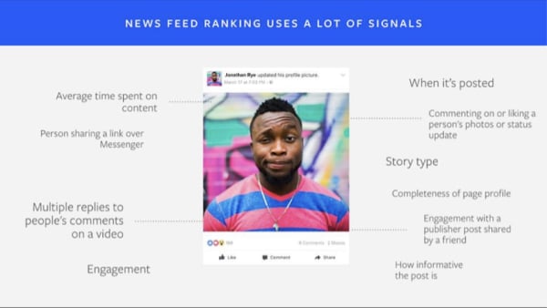 Lors d’un webinar de 2018 destiné aux médias, Facebook précise les signaux pris en compte avant et après le changement d’algorithme annoncé.