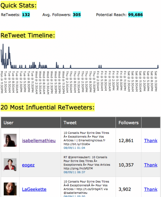 • la liste des 20 twittos les plus influents qui ont retweeté l’URL ainsi qu’un lien pour les remercier