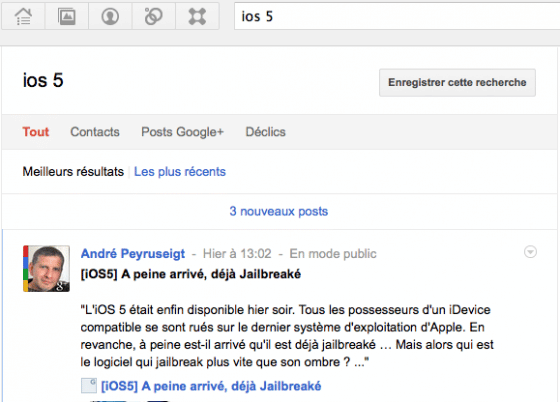 Lorsque vous recherchez une information sur Google Plus, vous pouvez maintenant faire une requête sur un mot ou une expression via le moteur de recherche du réseau social. Les résultats retournés s’affichent dans la partie centrale.