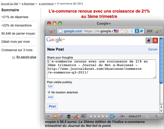 Lorsque vous activez l’icône « Share to G+ », une pop-up s’ouvre avec le titre et l’URL de l’article que vous souhaitez partager sur Google+. Vous pouvez ensuite ajouter un texte complémentaire, choisir le mode de visibilité (par défaut, publique) ainsi que la localisation.