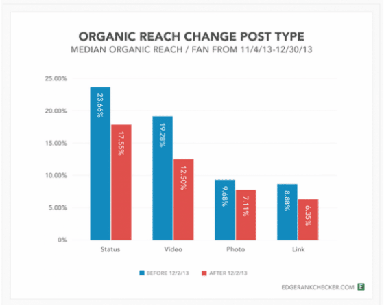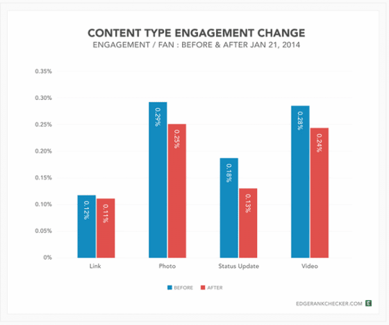 Pour rappel, EdgeRank Checker avait sorti une autre étude en décembre 2013 qui montrait que le type de publication par ordre décroissant d’importance était le statut, la vidéo, la photo et le lien.