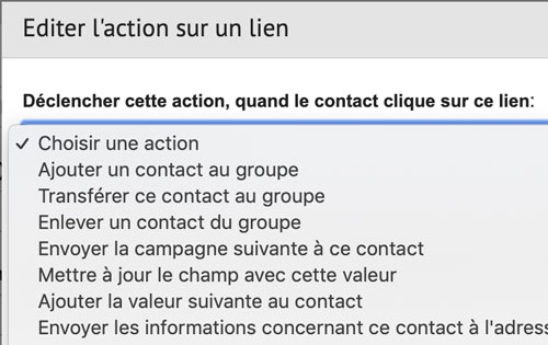 Notez que vous pouvez ajouter des « triggers » pour déclencher des actions quand une personne clique sur un lien de votre campagne. L’objectif est de vous aider à mieux comprendre votre audience et à optimiser vos prochaines campagnes.