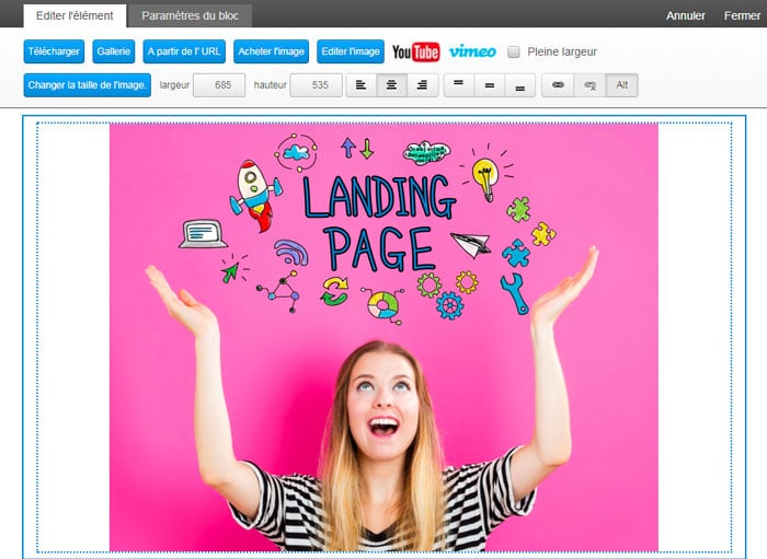 Selon vos besoins, vous pouvez modifier très facilement les blocs composants votre landing page (ex: galerie de boutons d’appel à l’action, champs du formulaire, attribution d’une liste lorsqu’une personne s’inscrit via le formulaire), ajouter de nouveaux blocs avec le système de Glisser / Déposer (ex: commentaires FB, bouton Facebook Like, bouton PayPal) ou configurer les paramètres (ex: marge, largeur de la page).